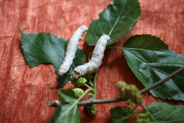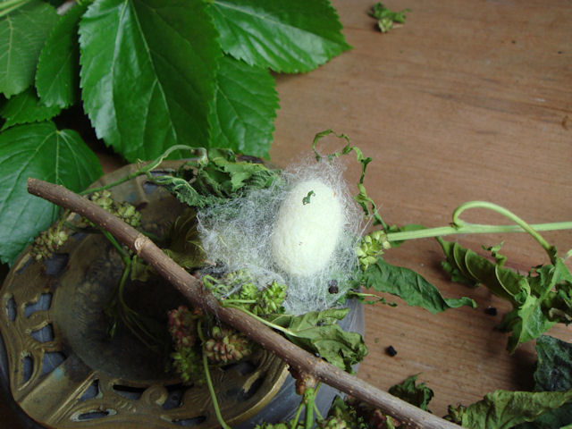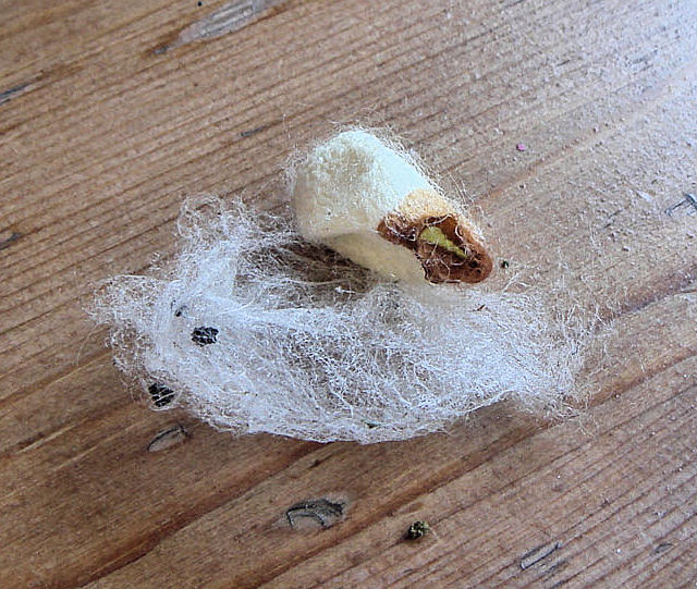 Circa 6 settimane dopo la schiusa, a sviluppo completo, il baco smette di alimentarsi, espelle liquidi per liberarsi dal contenuto intestinale, assume un colore giallastro trasparente e le due ghiandole della seta raggiungono il peso di 460 mg. I bachi da seta hanno un paio di ghiandole salivari modificate, chiamate ghiandole della seta, che secernono un fluido limpido e viscoso, secreto in forma di filo, attraverso aperture situate nell’ apparato boccale e chiamate filiere. Il diametro di queste aperture determina lo spessore del filo di seta prodotto, che non appena entra in contatto con l’ aria s’ indurisce, producendo il bozzolo. A questo punto, l’ obiettivo del nostro baco, non è più quello di nutrirsi, ma di trovare un punto adatto per ancorarsi e cominciare la costruzione del bozzolo che sarà completo dopo 3 giorni.