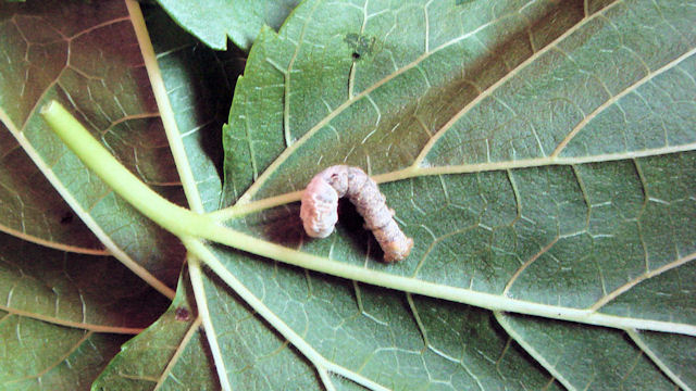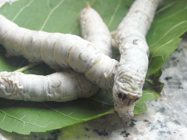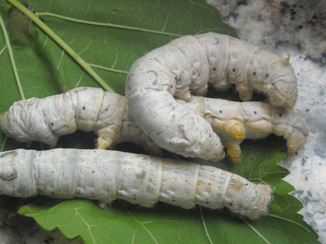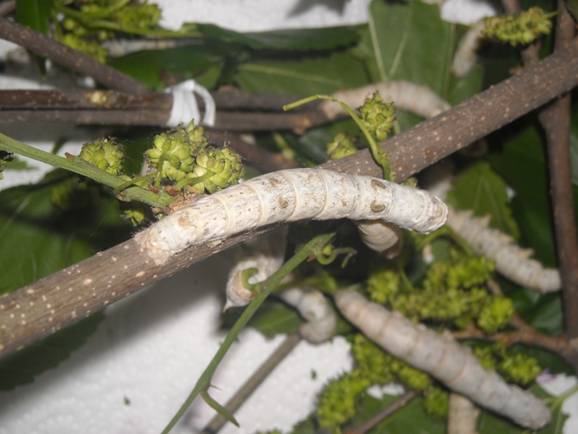 nascita il bruco è nero, peloso, lungo Voracissimo di tenere foglie di gelso, crescendo assume una colorazione biancastra. Prima di impuparsi e di costruire attorno a sé il bozzolo, subisce 4 mute; il nostro baco, come i serpenti, si libera dalla vecchia pelle rinsecchita e al termine del suo sviluppo pesa 8000 volte in più rispetto alla nascita ed il suo volume è circa 6000 volte maggiore.