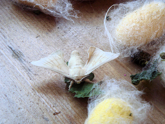 Negli allevamenti, tuttavia, questo processo viene interrotto artificialmente, poiché le falene uscendo dal bozzolo, producono lacerazioni che riducono il valore commerciale della seta. Pertanto, la maggior parte dei bachi viene uccisa con il calore (per immersione in acqua bollente o per essiccamento in forno) e le uniche falene che vengono fatte sfarfallare sono quelle strettamente necessarie alla perpetuazione della specie. Si