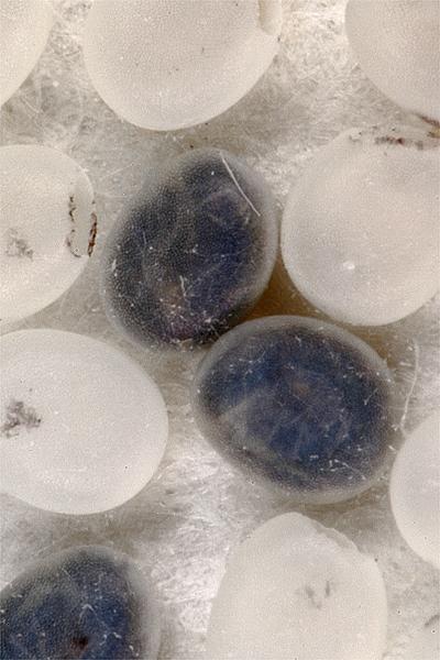 intervalli regolari, la femmina è in grado di deporre da Proprio in questi giorni, le farfalle hanno deposto centinaia e centinaia di uova: il semebaco è una sferetta di un millimetro di diametro, per averne un grammo occorrono 1700-1900 uova. Un tempo a ciascuna famiglia contadina che praticava l’ allevamento del baco da seta, veniva distribuita un’ oncia di uova, che corrispondeva ad un ditale colmo di semebaco (30 grammi=40.000-60.00 uova). La scelta della quantità del seme, dipendeva dal numero dei componenti della famiglia, dal posto disponibile e dalla sicurezza di avere foglia di gelso a sufficienza per il loro nutrimento. Appena deposte, le uova sono bianche-giallognole, per poi assumere un colore bluastro che conserveranno per tutto il lungo periodo di inerzia, fino alla loro schiusa. Conservate in una scatola a temperatura ambiente, per una sorta di orologio biologico interno, le prime uova si schiudono sempre attorno al 10 aprile.