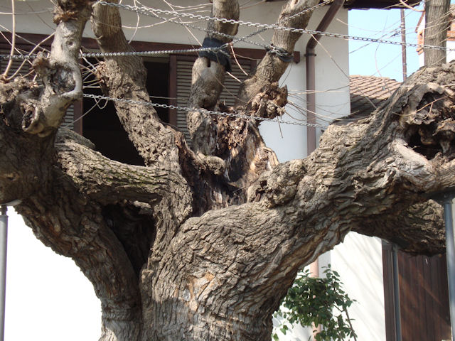 Le ramificazioni principali sono 5 ed a loro volta presentano ampie cavità interne in grado di indebolirne fortemente la tenuta meccanica. Sono stati posti 3 sostegni metallici e delle catene con funzioni di sostegno. Anche quest’ anno è stata effettuata una decisa potatura per ridurre l’ effetto vela della chioma e i carichi sul fusto, in modo da far affrontare alla pianta la vecchiaia in forma più compatta.